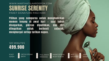 Rasakan ketenangan jiwa, kesegaran tubuh, dan kecantikan alami melalui perawatan premium khas Martha Tilaar. Dengan promo menarik ini, Anda bisa lebih mudah menikmati momen berkualitas bersama orang-orang tersayang di salah satu spa terbaik di Depok.