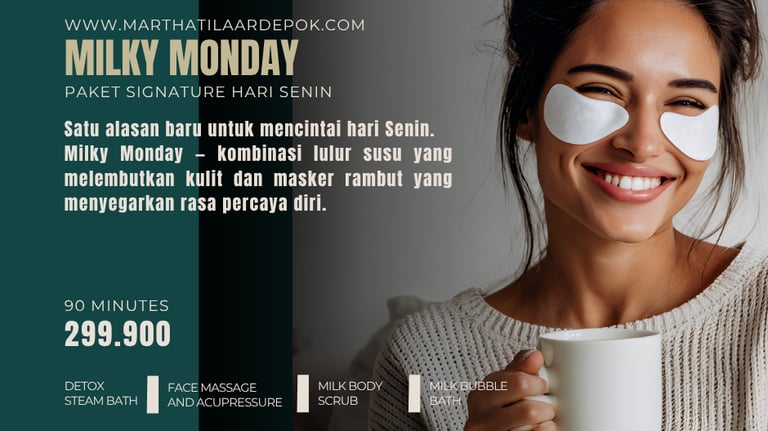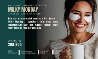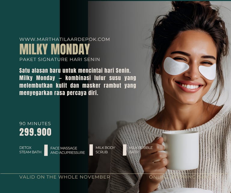 Hari Senin tak lagi melelahkan, Perawatan istimewa berbahan susu alami di perkaya extract lemon dan bunga nilam untuk melembabkan dan menghaluskan kulit, sekaligus mengurangi selulit di tubuh. Promo ini menawarkan relaxasi menyeluruh untuk tubuh dan pikiran, cocok untuk memulai "new week" mu yang luar biasa.